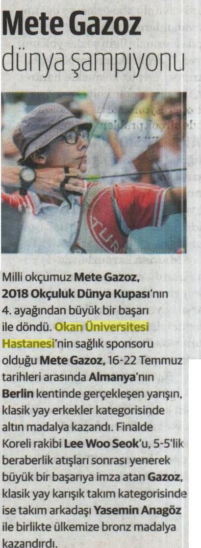 24.07.2018 Gazete Bursa BERLİN' DE DÜZENLENEN 2018 OKÇULUK DÜNYA KUPASI YARIŞLARININ AYAĞINDA, SPOR